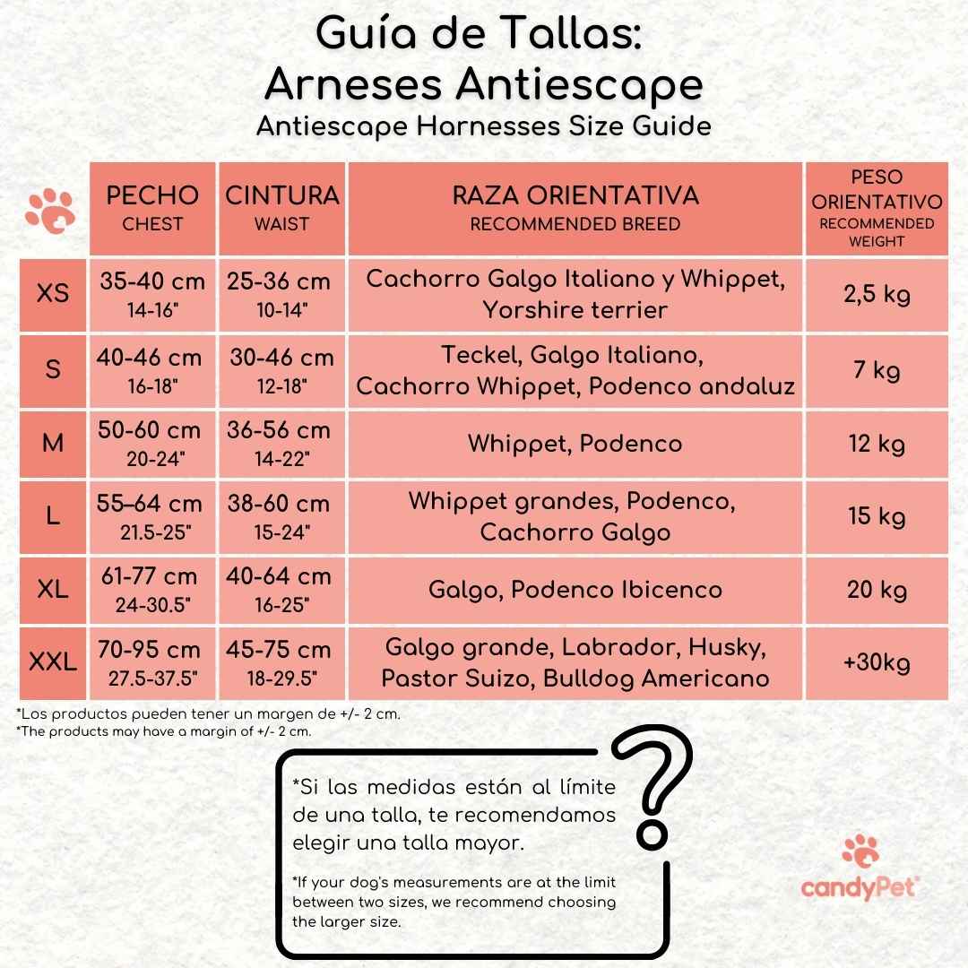 Ti mostreremo anche il modo migliore per misurare il tuo cane, così potrai scegliere quello giusto. Se hai ancora domande, inviaci un'e-mail a info@candypet.es o un messaggio WhatsApp: saremo felici di aiutarti! - E se quando ricevi il prodotto ti accorgi che non è la tua taglia e hai bisogno di una taglia più grande o più piccola, non preoccuparti, offriamo resi GRATUITI per ordini pari o superiori a 49 € (opzione valida solo per la Spagna continentale), così potrai semplicemente effettuare un nuovo ordine quando preferisci.